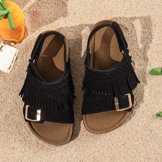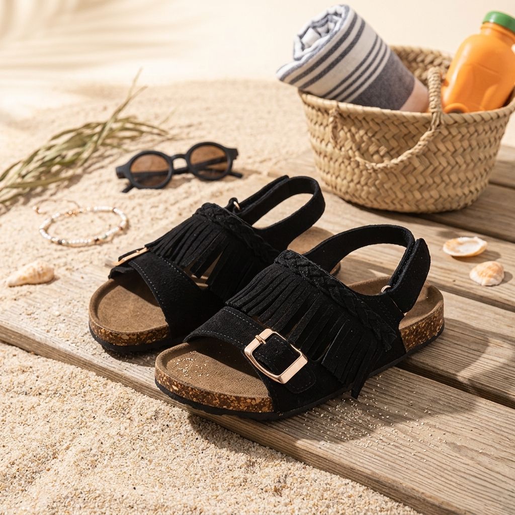 Ben je op zoek naar de perfecte zomerschoentjes voor jouw kleine fashionista? Deze meisjes sandalen met fringe in de kleur zwart zijn dé eyecatchers van dit seizoen. Met een unieke combinatie van een trendy zwarte kleur, speelse franjes (fringes) en een prachtig gevlochten bandje, geven deze meisjes schoenen elke outfit een zomerse bohemian look.